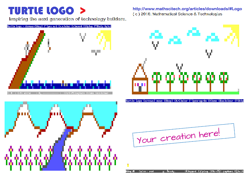 Previous Release (26 Nov 2016) - Turtle Logo v1.4 - Entirely key operated, suitable for ages from 3 years to adult. 750 lines of Forth code. Algorithmic drawing program with advanced features, incl. macro record & playback, color, and much more! Works on WinXP to Win10.